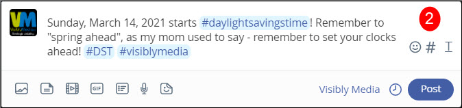 - Write your post. Include the keywords and hashtags you want to use, and be ready to add an art, sound, or video file. In the screenshot, you’ll see the following seven (7) options in the bottom left corner to choose from: photo, file, video, .gif (includes an animated .gif, which is different from a video), poll, voice/audio, or stickers. For this post, I chose an image.