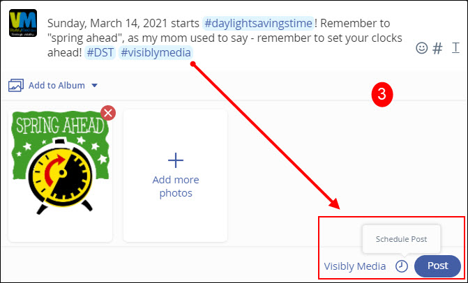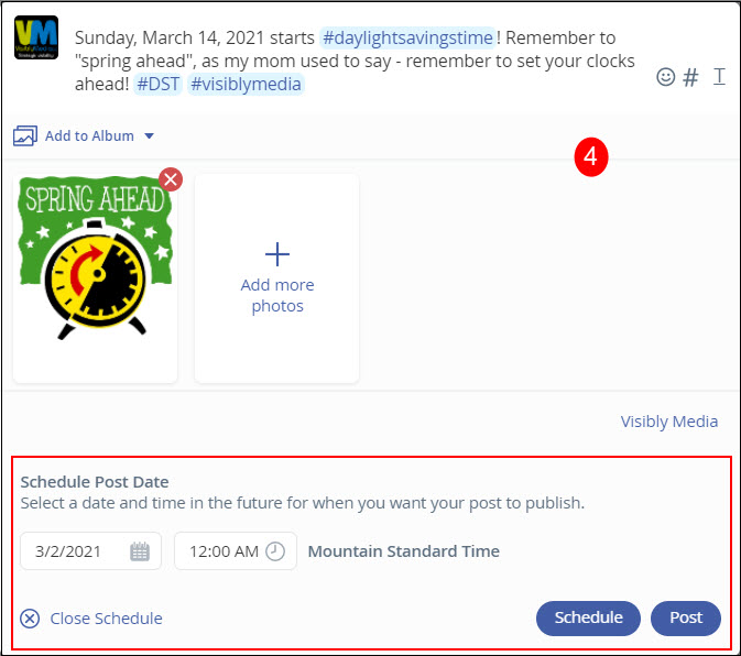 - When you’re finished setting this all up, click the blue Post button, and your post is set in the schedule queue.